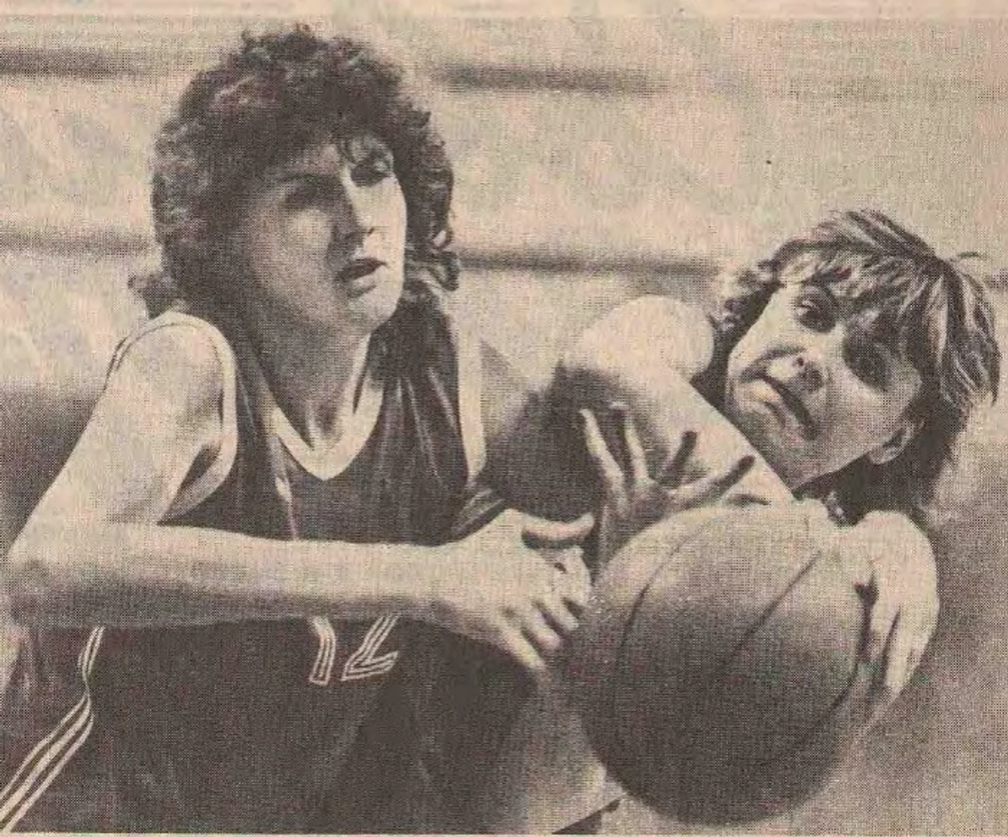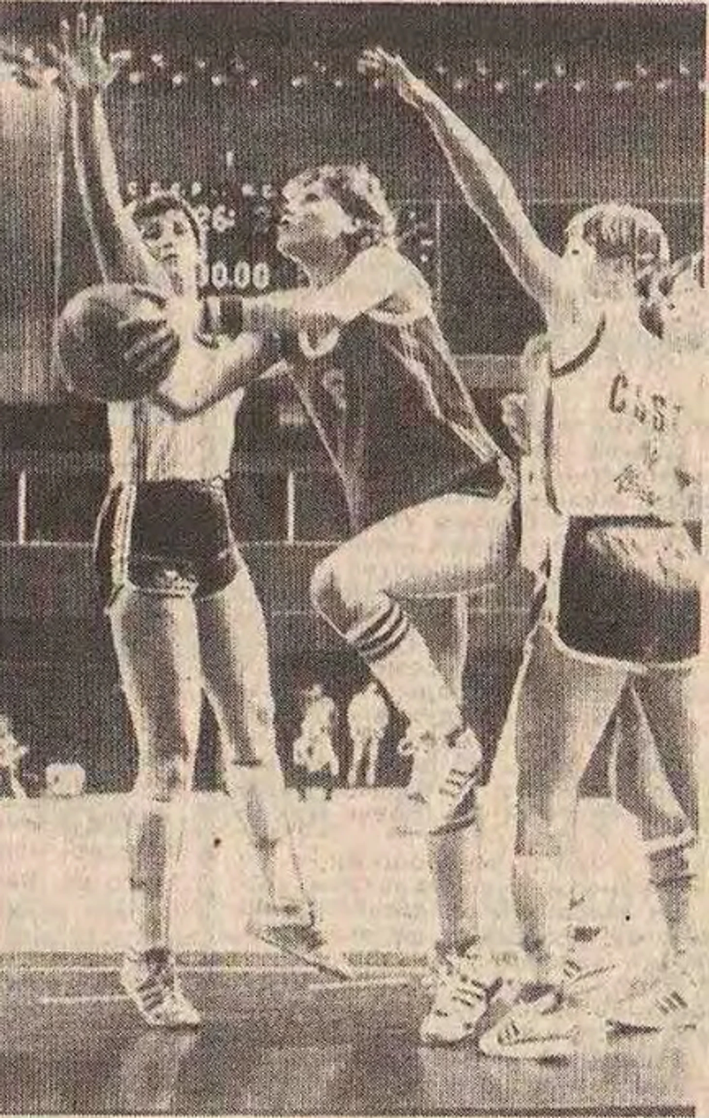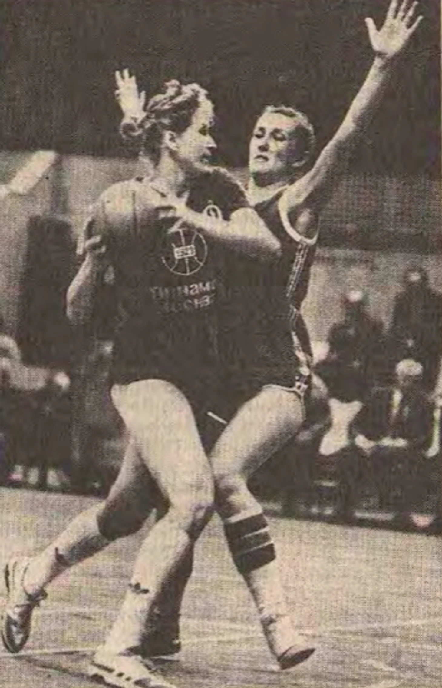 11 апреля 1989. Москва. УСЗ ЦСКА. Третий матч суперфинальной серии LVI чемпионата СССР ЦСКА — «Горизонт» — 93:85. Светлана Кузнецова (№ 5) и Татьяна Комарова (№ 10) создают коробочку минчанке
