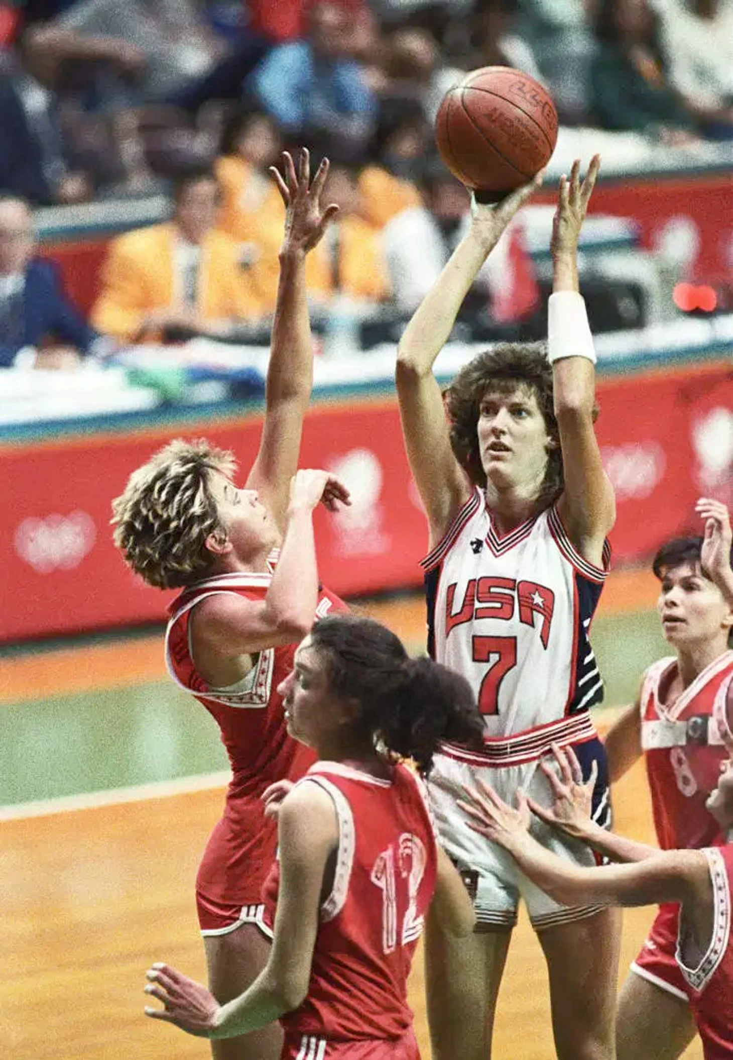 27 сентября 1988. Сеул, Южная Корея. Полуфинал XXIV Олимпийских игр СССР — США — 88:102. Елена Худашова (№ 12), Галина Савицкая (слева) и Ольга Бурякина (№ 8) против Энн Донован (№ 7)