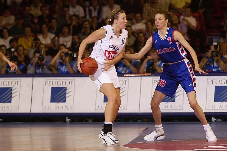 23 сентября 2001. Ле-Ман, Франция. Финальный матч XXVIII чемпионата Европы Россия — Франция — 68:73. Елена Худашова (справа) против Изабеллы Фиалковски