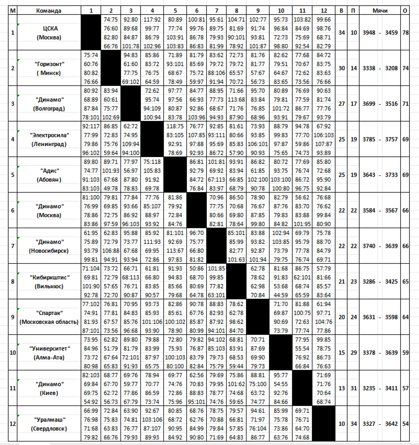 Конец марта получился интригующим. Вернувшееся в высшую лигу московское «Динамо» поделило очки в домашних встречах с «Электросилой» — 88:97 и 93:92. За 11 секунд до окончания второй встречи хозяйки вели — 92:88. И тут право на три штрафных броска получает ленинградка Щербакова. Первые два точны, третий специально «мажется», мяч подбирает ее партнер Засульская, и — 92:92. Дополнительное время? Нет! Москвичка Евгеньева прорывается к щиту и за секунду до окончания матча получает право на два штрафных броска, один из которых был точен. Москвички первыми закончили сезон. У них равное количество побед и поражений — по 22.