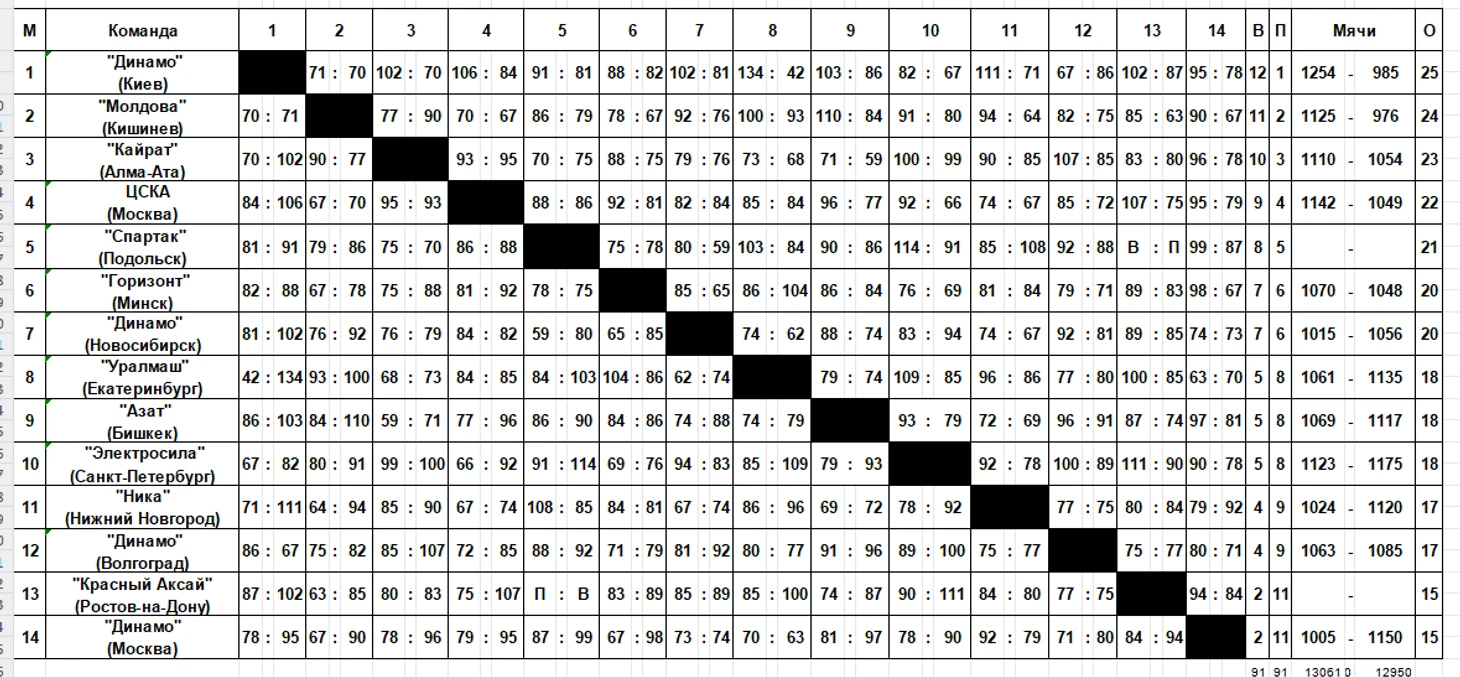 Полную таблицу того странного чемпионата восстановить уже невозможно, но количество набранных очков и места команд известны.