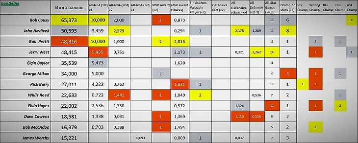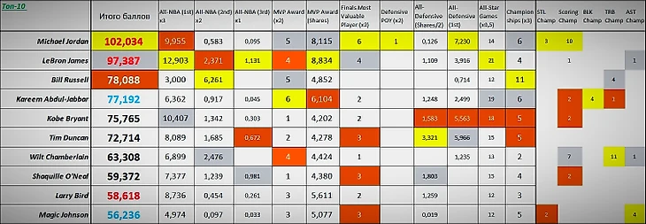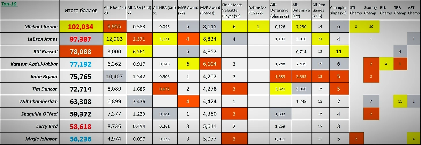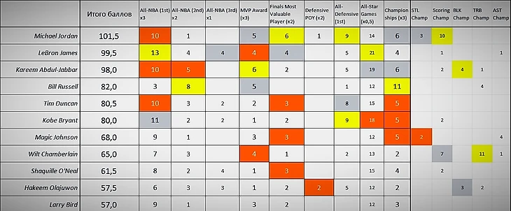 На баскетбольном Олимпе те же лица, о которых постоянно спорят в самом американском сообществе эксперты и аналитики, но сейчас мы видим их цифры и все их разнообразие талантов одной строкой. В топ-11 исключительно мульти-чемпионы, все были MVP и все (кроме Билла Рассела…какая ирония) получали трофей эмвипи Финала (названный в честь легендарного игрока Бостона 60-х).