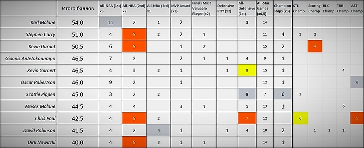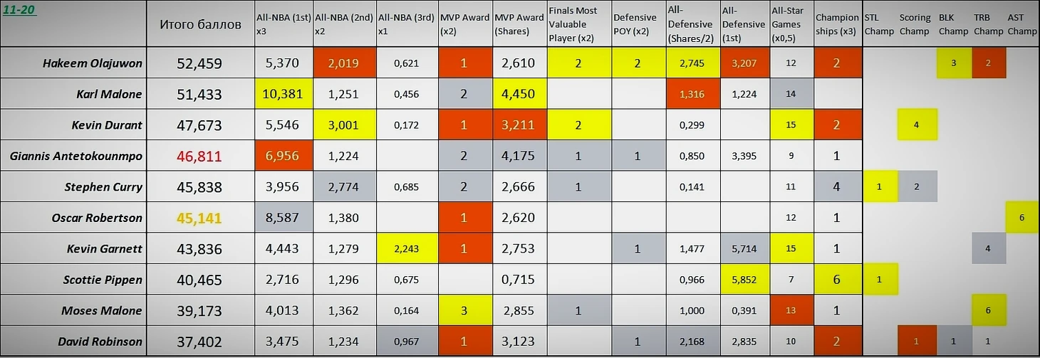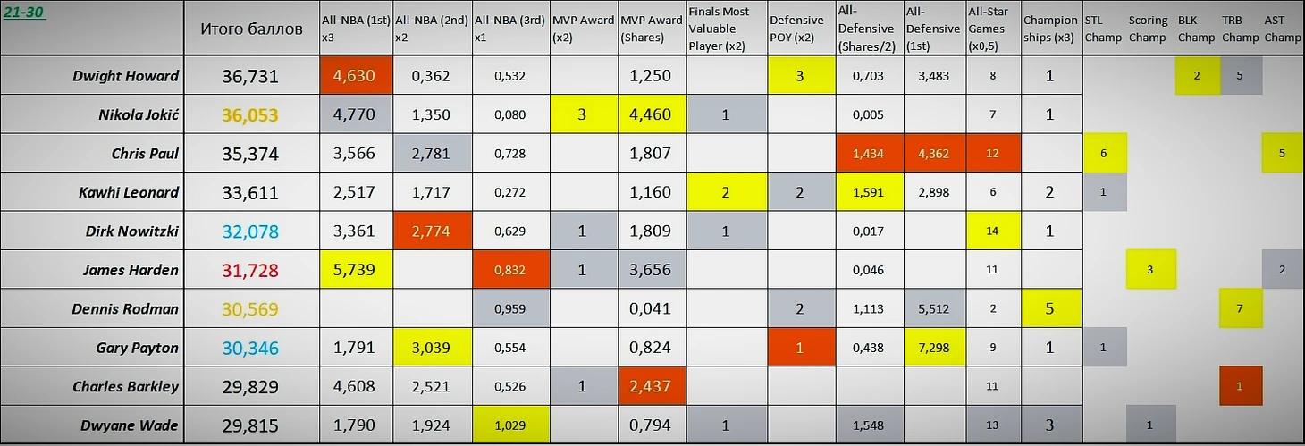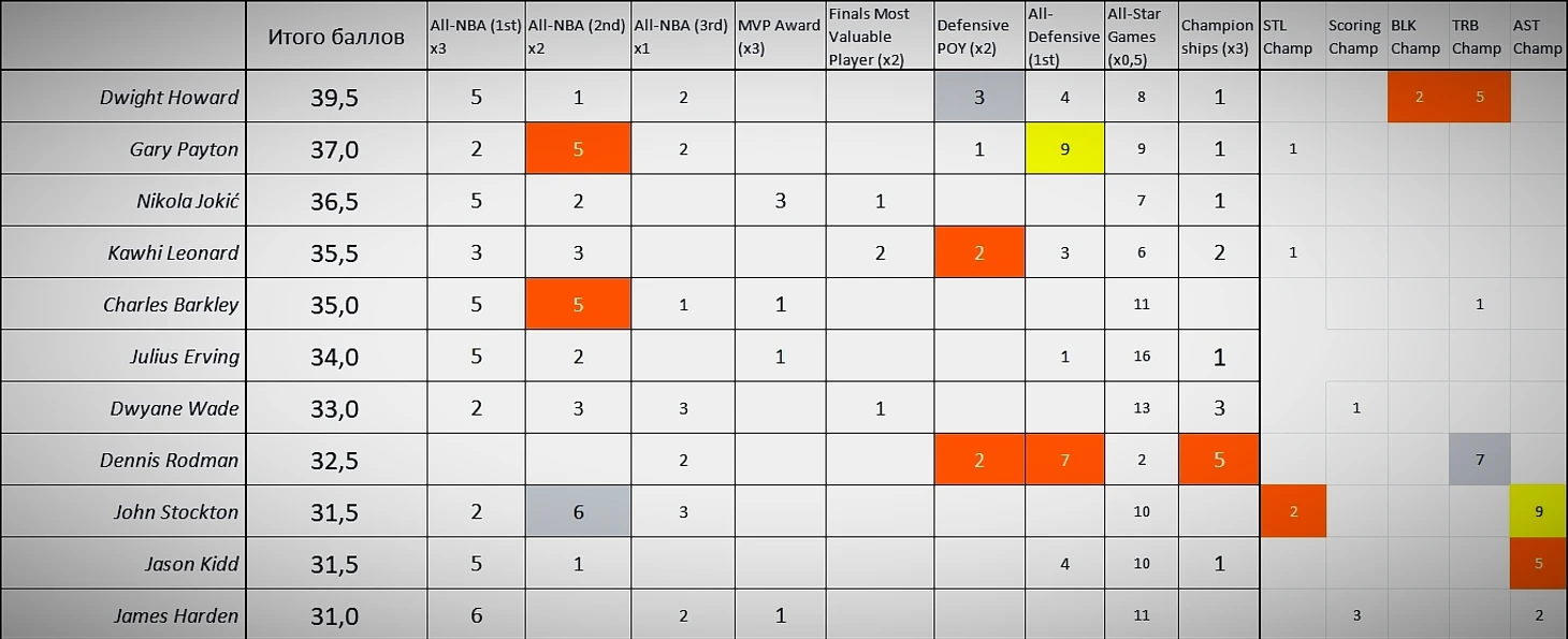 Кстати именно баллы за ДиПОЯ и за «чемпов» в разных стат-категориях поднимают Майкла Джордана над его главным раздражителем и преследователем. Скажу честно: цели «спасти Майка» не было, но по формуле Acuity они были бы сейчас на одной ступени))