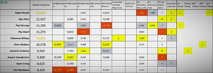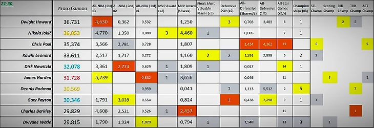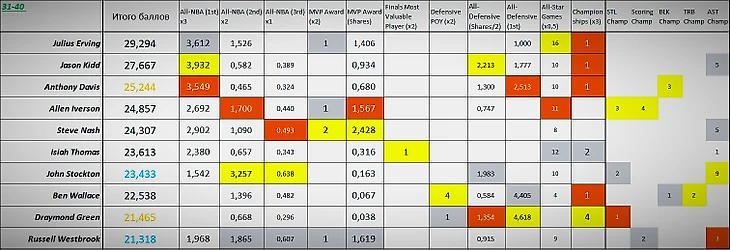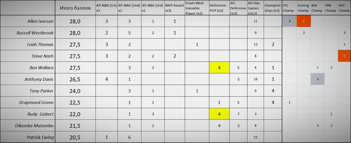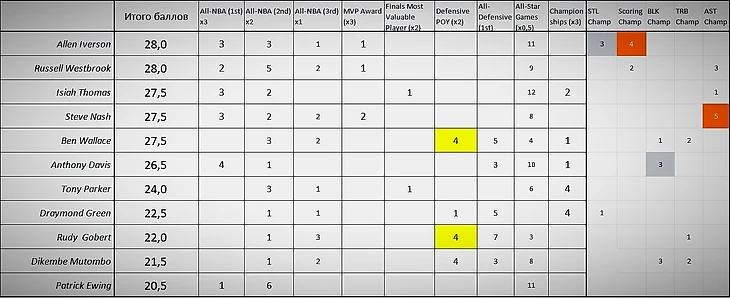 Интересные соседи в четвертом десятке. Здесь и три самых титулованных «Мистера Замка» в лиге, и очень знаковые для лиги атакующие защитники с разыгрывающими. На равне встали одинаковые по энергии по словам самого Ансвера Расс и Айверсон
