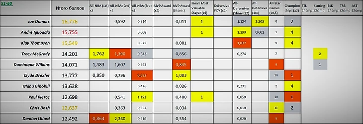 Шестой десяток – это концентрат из лучших игроков второго плана, решавших исход многих титулов не будучи первой скрипкой. Ти-Мак и Доминик Уилкинс были первыми в своих клубах – но расплатой стала им медальная засуха при отличных карьерах