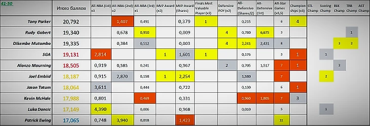 Современная молодежь (Тэйтум, ШГА, Эмбиид и Лука) появились уже в пятом десятке и при правильном распределении сил смогут в ближайшие пару лет уверенно заходить в рейтинг 31-40.