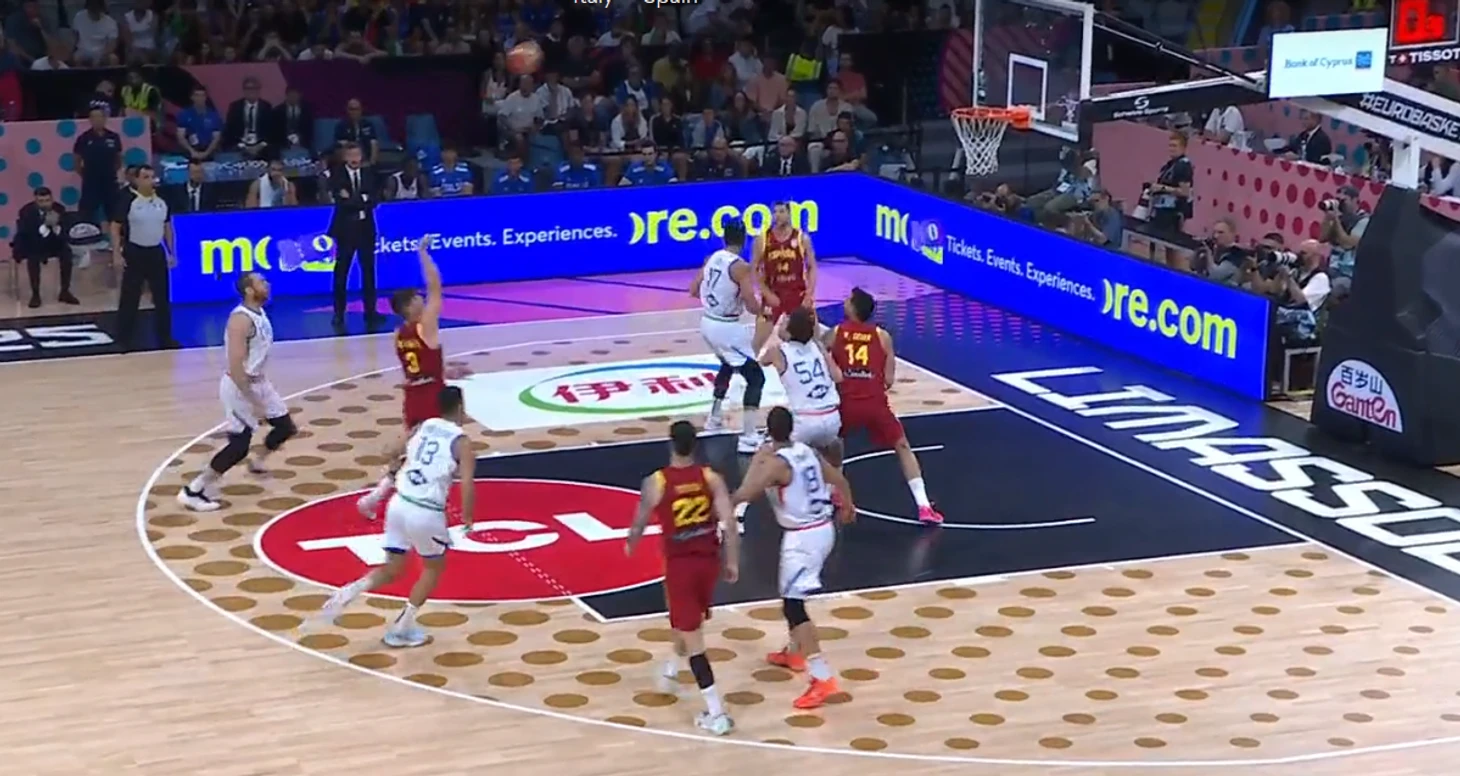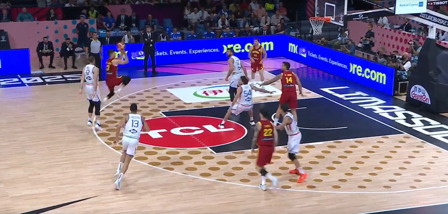 Он произошел в начале третьей четверти матча между Испанией и Италией. Соперники не только яростно промахивались из-под кольца, но и иногда радовали акробатическими этюдами – и вот 19-летний разыгрывающий испанцев Серхио Де Ларреа реализовал дальнюю попытку, хотя приземлился в районе линии штрафных.