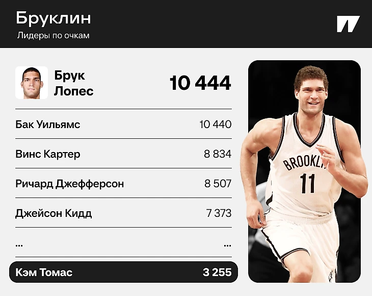 ● Самое низкое количество очков среди всех лучших бомбардиров франшизы – в «Бруклине» у Брука Лопеса (10 444), больше всех за один клуб набрал Карл Мэлоун в «Юте» – 36 374.
