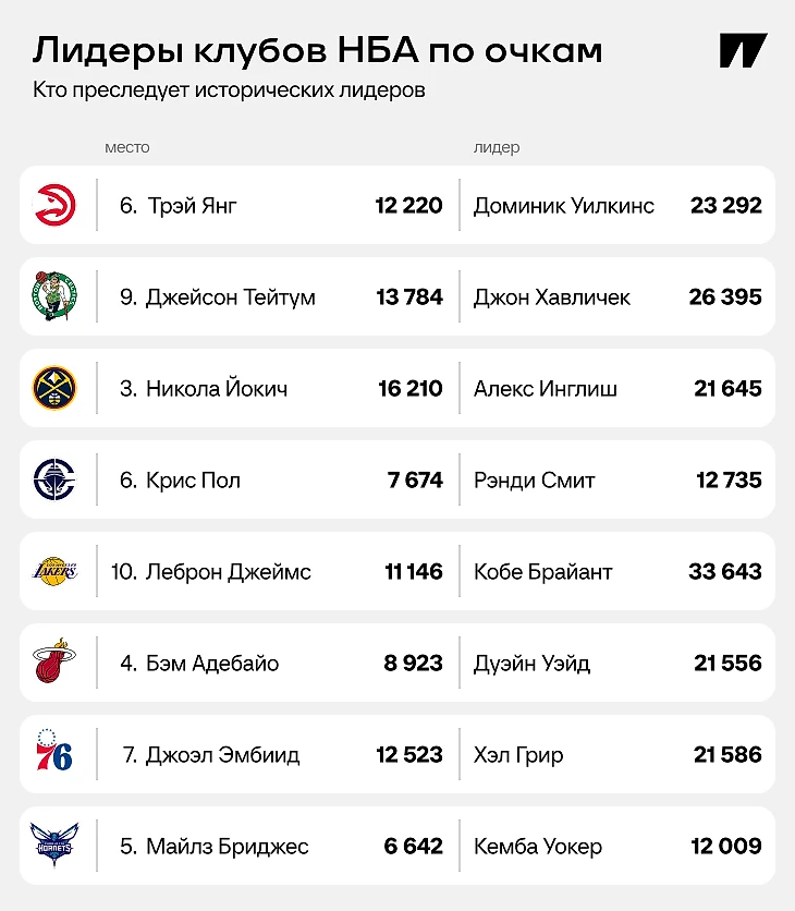 В восьми клубах НБА лидер среди всех действующих баскетболистов – в текущем составе и ведет активную погоню за лучшим бомбардиром в истории франшизы. Окей, в случае Тейтума – не совсем активную на данный момент.