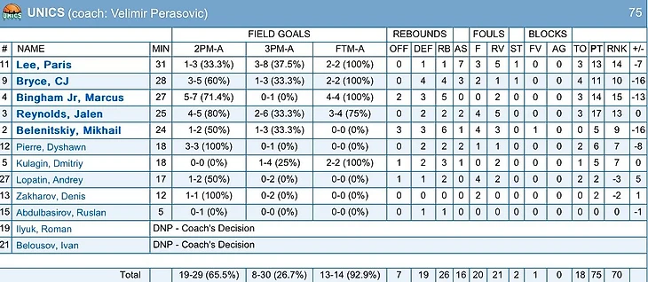 Именно дальнее попадание американца сделало разницу в счете «+10» для армейцев. После тайм-аута УНИКСа Лопатин промахнулся из-за дуги, а затем он совершил пробежку. Кливленд забил с фолом 3-очковый, что окончательно дало понять, кто выиграет игру. Антониус еще и заблокировал бросок Лопатина. Брайс и Бингэм набрали последние очки в матче.