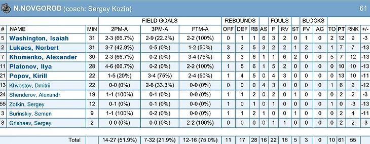 Безусловно, нижегородцы были не в полном составе. Большую роль сыграло отсутствие «больших». Но ощущение, что и с ними на паркете был бы тот же результат. Подопечные Сергея Козина не показали ничего интересного в атаке. Наверное, можно уже говорить, что селекция в этом году если не провалилась, то близка к этому. Хоть что-то показывает только Вашингтон, но он тоже нестабилен. Лукач за 6 игр имеет 0 из 17 из-за дуги. Костяк из российских игроков неплох, но это все хорошие ролевики. Лидера на площадке нет. Даже интересно, сможет ли что-то придумать Козин с этим составом. К сожалению, пока что «Нижний» – одна из худших команд чемпионата.