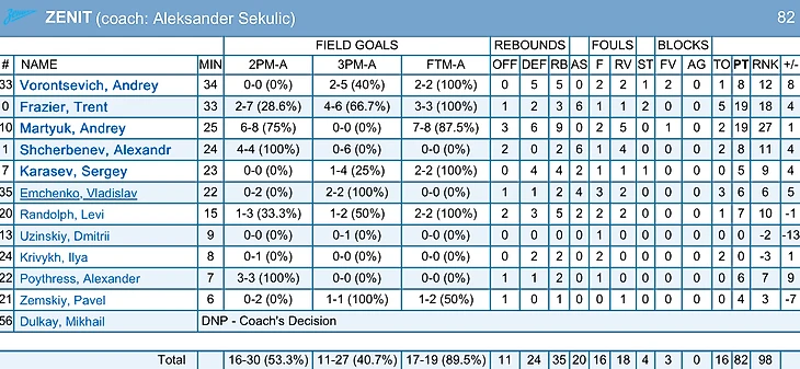 «Зенит» снова справляется с травмами, одерживая победу не в полном составе. Сегодня провалили 3 четверть и отдали подбор на своем щите. Пока летело из-за дуги были впереди. Моментами очень топорно играли в атаке, не создавая пространства для броска. Так как обзор на эту игру пишется достаточно долго, дошла информация, что Алекс Пойтресс, к сожалению, выбыл до конца сезона. У него разрыв крестообразной связки колена. «Зениту» придется выходить на рынок в поисках нового центрового. Жаль, что Ройс Хэмм уже подписал контракт с «Трабзонспором».