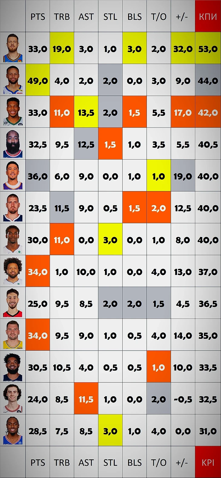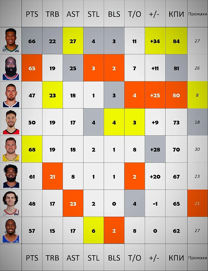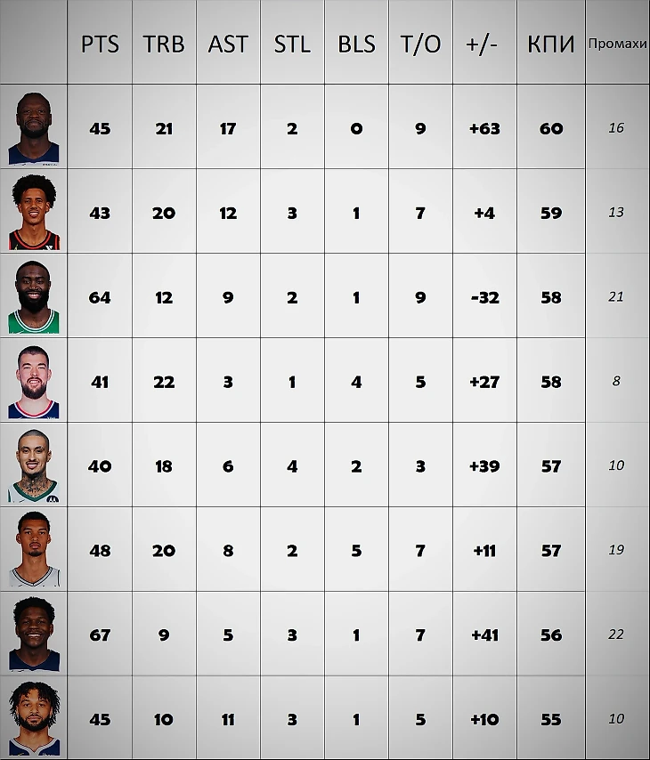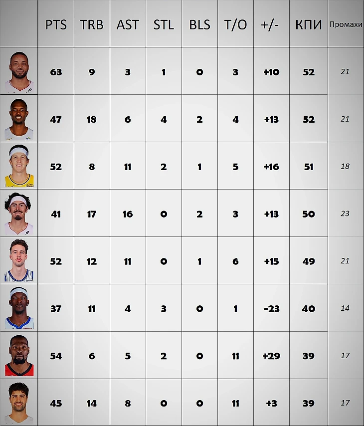 Были игроки с одноматчевыми феериями, лучших - возьмем в итоговый рейтинг со средними показателями за игру. Стэф развлекался против Сан-Антонио. Хартенштайну дали потоптать Сакраменто, Букер с Финиксом плющил Юту. Сказав «а», придется сказать и «б». Вероятно даже у этих красавчиков получится.