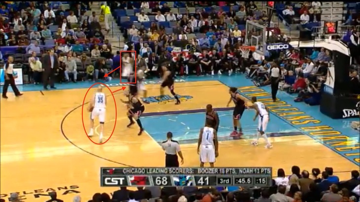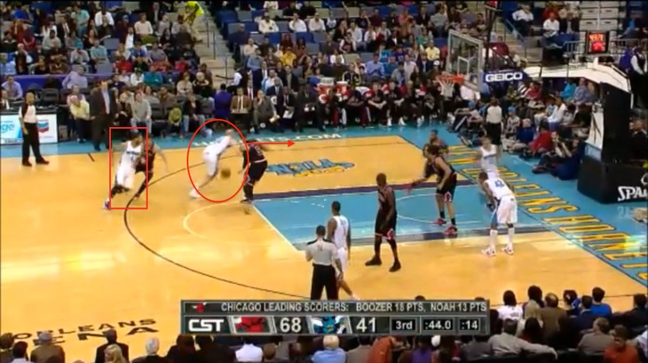 Опытный центр начинает владения против Чикаго Булс , также мы видим атакующего защитника Хавьера Генри в углу:Каман и Генри направляются друг к другу: