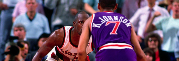 Стив Фрэнсис воспринимается как самый летающий и эффектный первый (правда с дефисом) номер в истории, но именно Кевин Джонсон вколотил один из самых красивых мячей за все времена в плей-офф, когда вложился в данк всей своей жизни так, что Хакима Оладжувона, щеголявшего MVP регулярного чемпионата и финалов и лучшего оборонительного игрока по итогам того сезона, отнесло фактически к скамейке запасных. Никто и никогда не лепил через него так, как Кев. Он выше меня сантиметра на три.