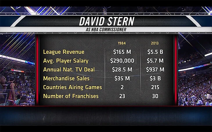 А затем пришла эра кабельного телевидения в США, рейтинги все росли, игры НБА стали показывать и за пределами Америки, контракты заключались на все более выгодных условиях для лиги. Последний раз НБА продавала права на показ матчей в 2008 году, заключив соглашение с TNT и ESPN на сумму в 7,44 миллиарда долларов. Стерн знал, что только телевидение может сделать его лигу действительно популярной.