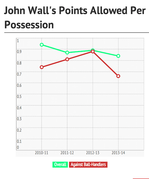 Согласно Synergy Sports основной пг "волшебников" когда защищается против оппонента с мячом, позволяет им набирать лишь 0.66 очка в среднем на владение, что является 23 показателем в лиге. Раньше Уолл никогда не опускался ниже планки 0.74 и не был выше 42 места в этом рейтинге.