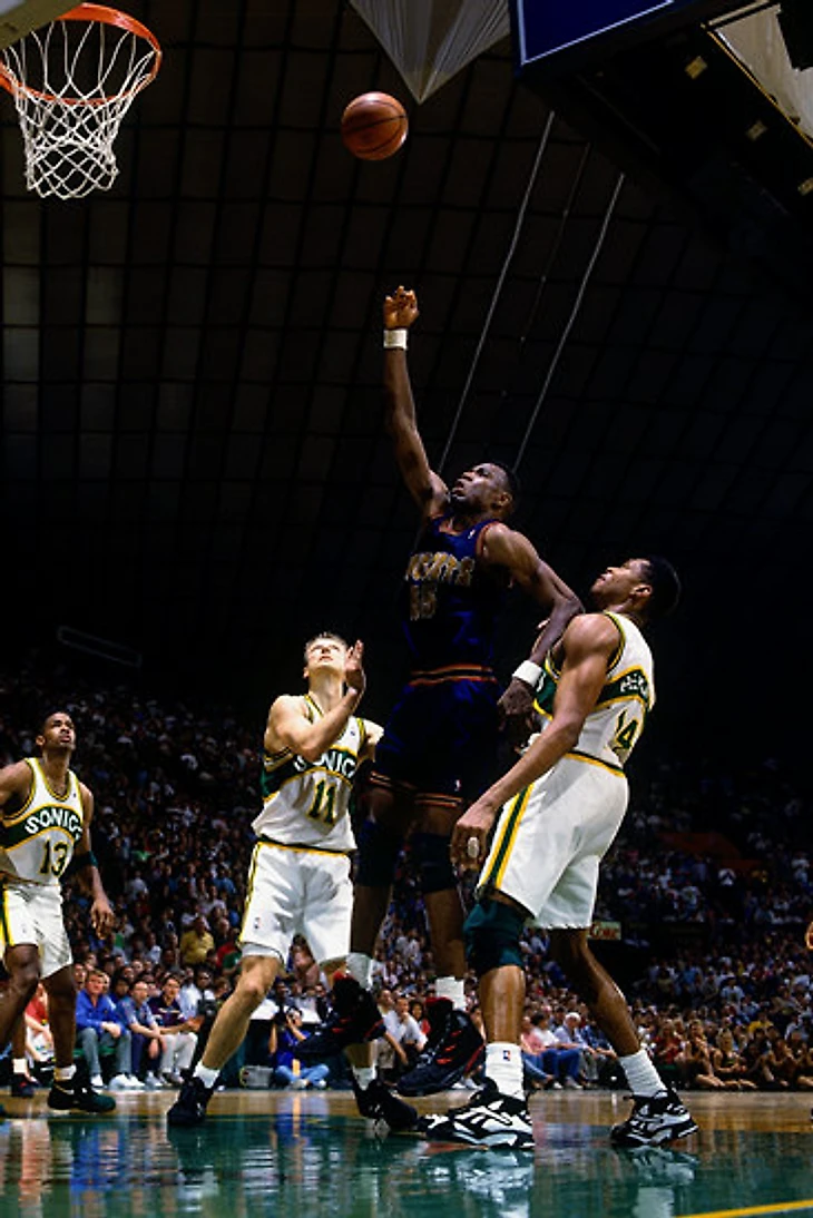 Знаменательная победа в пятой игре серии первого раунда 1994 года вошла в историю не только благодаря экстатическому празднованию знаменательного события конголезским гигантом Дикембе Мутомбо. Это был первый случай, когда команде, сеянной восьмой, удавалось одержать верх над победителем Западной конференции. Тот «Денвер» был не просто восьмой командой. Коллектив, который составляли лишь несколько игроков с минимальным опытом выступления в лиге, умудрился сначала неимоверным образом просочиться в плей-офф (42-40), а потом еще и огорчить амбициозную команду Карла, движимую тандемом Шона Кемпа и Гэри Пэйтона. «Самородки» вполне ожидаемо уступили в двух первых матчах, потом проявили себя в домашних встречах и ответственно подошли к пятой решающей встрече: овертайм (98:94) позволил игрокам «Денвера» вписать свои имена в летопись НБА.