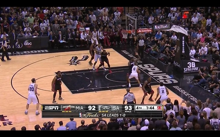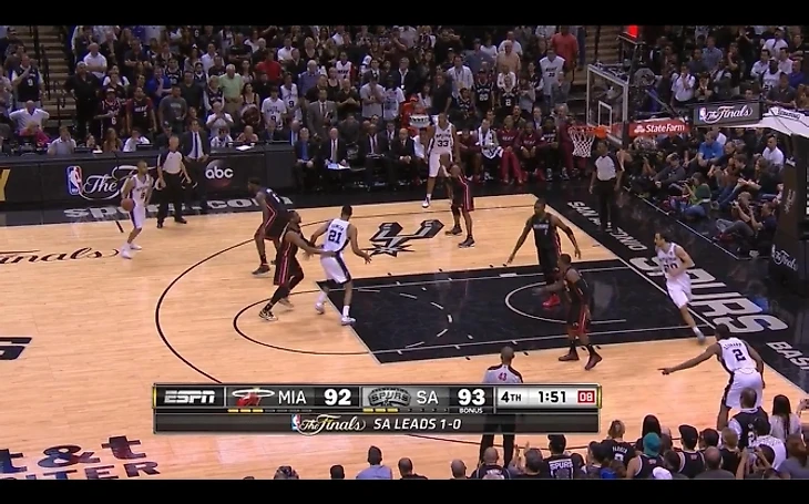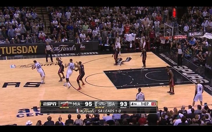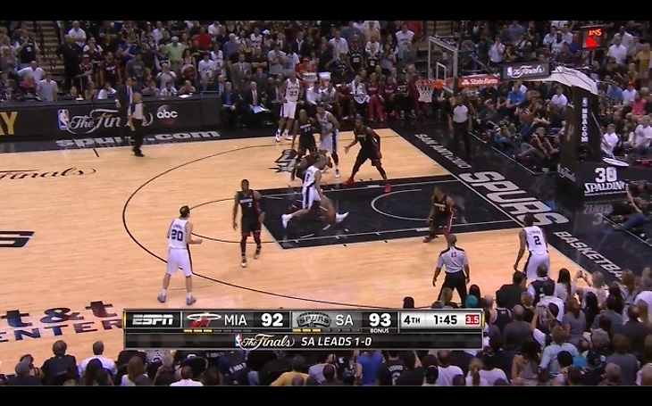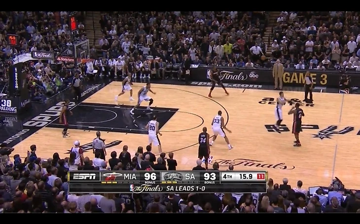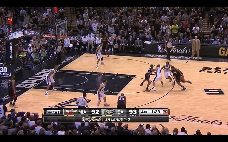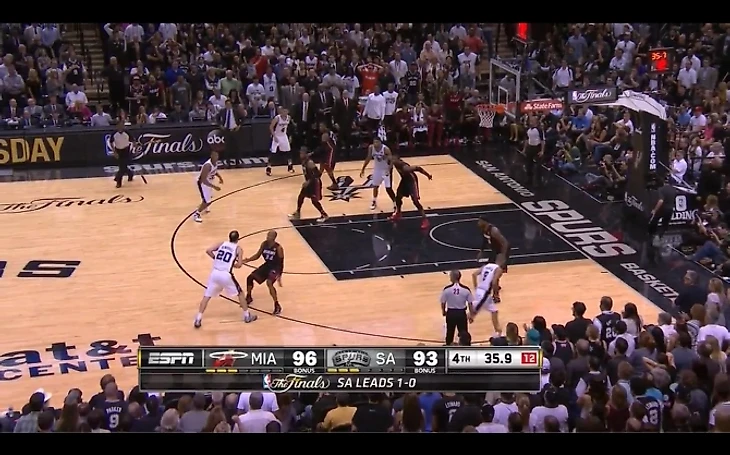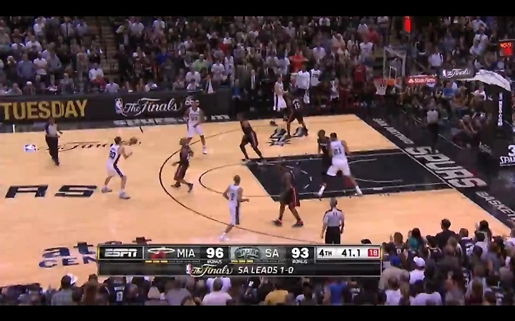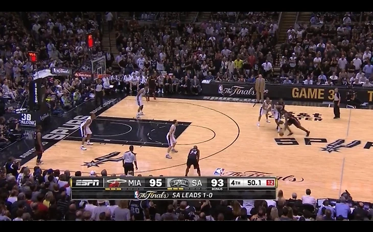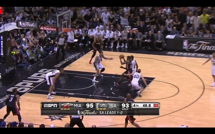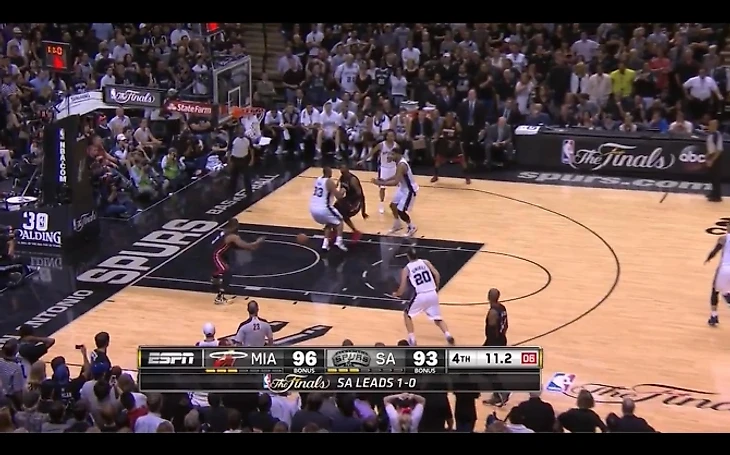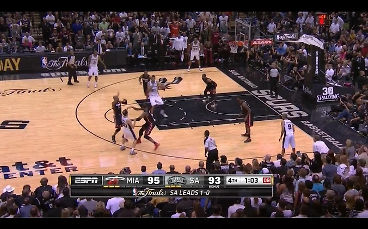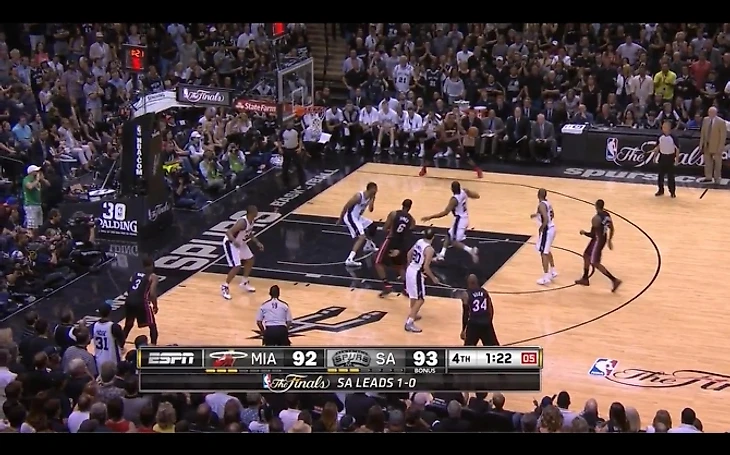 28,3 секунды до сирены, 96:93 в пользу «Хит», владение «Майами». «Сперс» решают не фолить и пытаются отзащищаться, но на половине владения Дьо подводят нервы – он убегает на периметр, чтобы заставить «Хит» выбросить мяч пораньше.