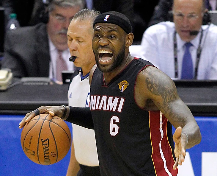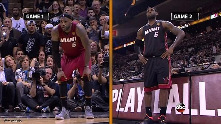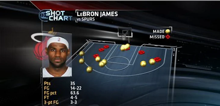 Затем выдал совершенно невероятное выступление во второй половине. Суть не в 35 очках, не в 14 из 22, не в 3 из 3 трехочковых. «Сперс» защищались против него практически идеально на протяжении всего матча: не давали идти в проход под щит, практически не нарушали на нем правила, при этом достаточно плотно опекали его и на дистанции (не отходя на метр, как это было в прошлогодней серии). И в не совсем характерной для себя манере, играя от броска и не форсируя ситуацию, Джеймс остался на прежнем уровне эффективности и попадал сумасшедшие мячи, позволяя «Хит» всегда оставаться в игре. При этом он еще и вынудил Кавая Ленарда перебрать фолов, так что тому опеку вновь пришлось делить с Борисом Дьо (Попович даже не усаживал Ленарда на скамейку – просто переводил на Рашарда Льюиса).