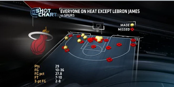 Уже к первой половине стало казаться, что постулат Руди Томьяновича касается далеко не всех: «Хит» словно бы растворились сами – без агрессии впереди, без лидеров, без характера в защите, без сердца чемпионов. Давно понятно, что Большого Трио давно нет, но этот раз вскрылось другое: без полноценного ЛеБрона (Джеймс в первой половине разрывался между паркетом и туалетом) нападение начало барахлить, и ни Уэйд, ни Бош не смогли наладить командное взаимодействие. Первый сбился на проходы, которые утыкались в частоколы рук (в итоге 3 из 13), второй бодро начал, но затем быстро потерялся (5 из 11). Когда Джеймс все же вернулся и нащупал ритм, его команда уже была в каком-то размякшем поникшем настроении, так что реанимировать ее он так и не смог. Индивидуально он смотрелся практически так же, как обычно: клал сумасшедшие трехочковые, обманывал Ленарда в усах, брал инициативу. Но главная для него статистика в этом матче не 28 очков, а соотношение передач к потерям (2-3): «Сперс» уничтожили нападение «Хит» и не дали их главному плеймейкеру создавать ситуации для партнеров. Так как ни один из номинальных разыгрывающих «Хит» в этой серии так себя и не показал, то для одного ЛеБрона это оказалось слишком. Даже несмотря на то, что Споэльстра целиком и полностью положился на главный козырь и перешел на игру маленькой пятеркой. (Отчасти этим можно объяснить соотношение подборов (25-44), но не оправдать его).