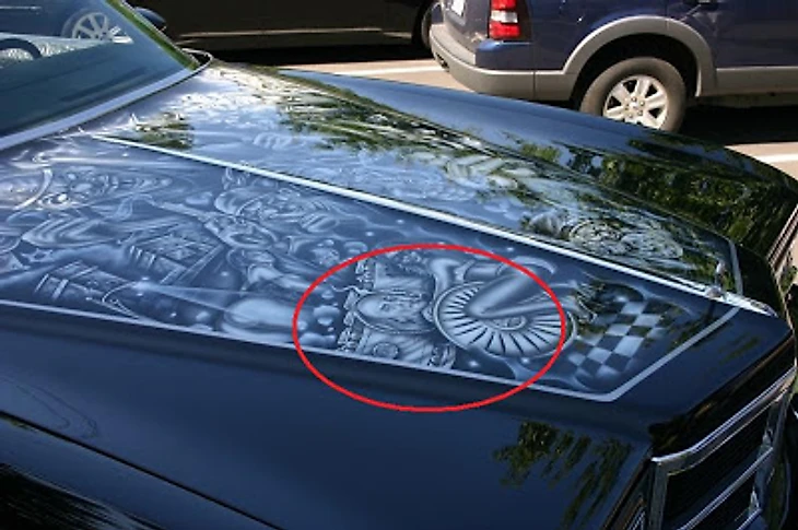 В данном случае радует не столько сам автомобиль и его «доделка», сколько заковыристая аэрография. Рядом с голой барышней примостился Бенджамин Франклин, наслаждающийся травкой. Художнику стыдно ездить на менее креативном агрегате.