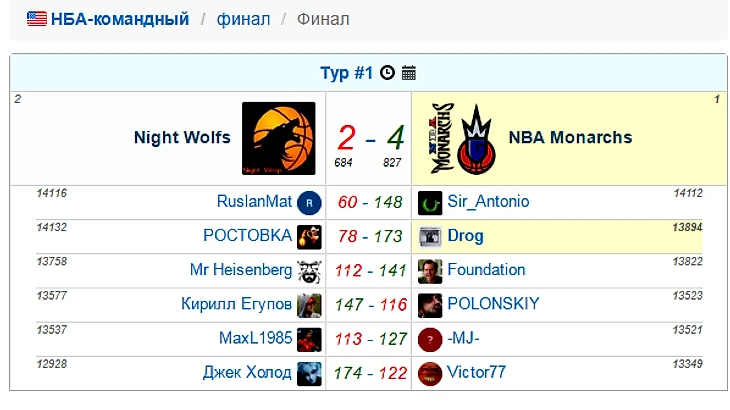 Монархи же абсолютно на расслабоне прошли регулярку, 3-е место как с куста )) Тех, кто послабее - обыгрывали, командам посильнее - сливали )) Короче, не парились. Обсуждений по ходу почти не вели... А вот в ПО пошла уже хорошая игра, наших друзей Гризликов в 1-ом раундепрошли чудом из чудес )) Помог треш-ток и Его Величество случай )) Наш -MJ- должен был брать последней заменой в воскресенье Пола, но прошляпил дедлайн, в итоге был вынужден ставить Казинса - больше игр не было никаких ) И Казинс с Робином Лопесом затаскивают под 70 ФО в последней игре на пару! Даже 5 лишних ФО дали, перестарались ))) А проигрывали всю неделю просто без шансов. В полуфинале нам уже дышалось попроще, имели преимущество в заменах, но потратили их не очень удачно и к последнему дню завязалась лютая интрига с Fiery Shadows - выжили с трудом )) Карри сопов не заефеерил, а наш Клэй затащил.