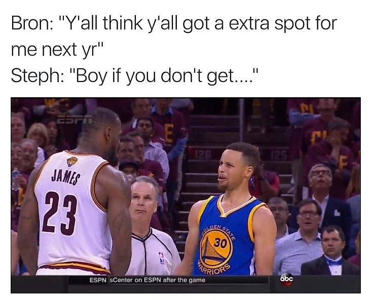 Затем после одного из выносов из-за боковой Джеймс придержал Карри и после жалоб последнего счел своим долгом соприсутствовать на консилиуме арбитров и довести лидера «Голден Стэйт» до нового интернет-мема.
