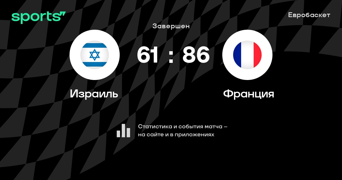 В прошедшем матче в рамках турнира Евробаскет (Групповой этап. 5 тур) состоялась встреча команд Израиль - Франция в городе Монпелье (Франция) на стадионе Парк-энд-Сьютс Арена (вместимость - 10700)