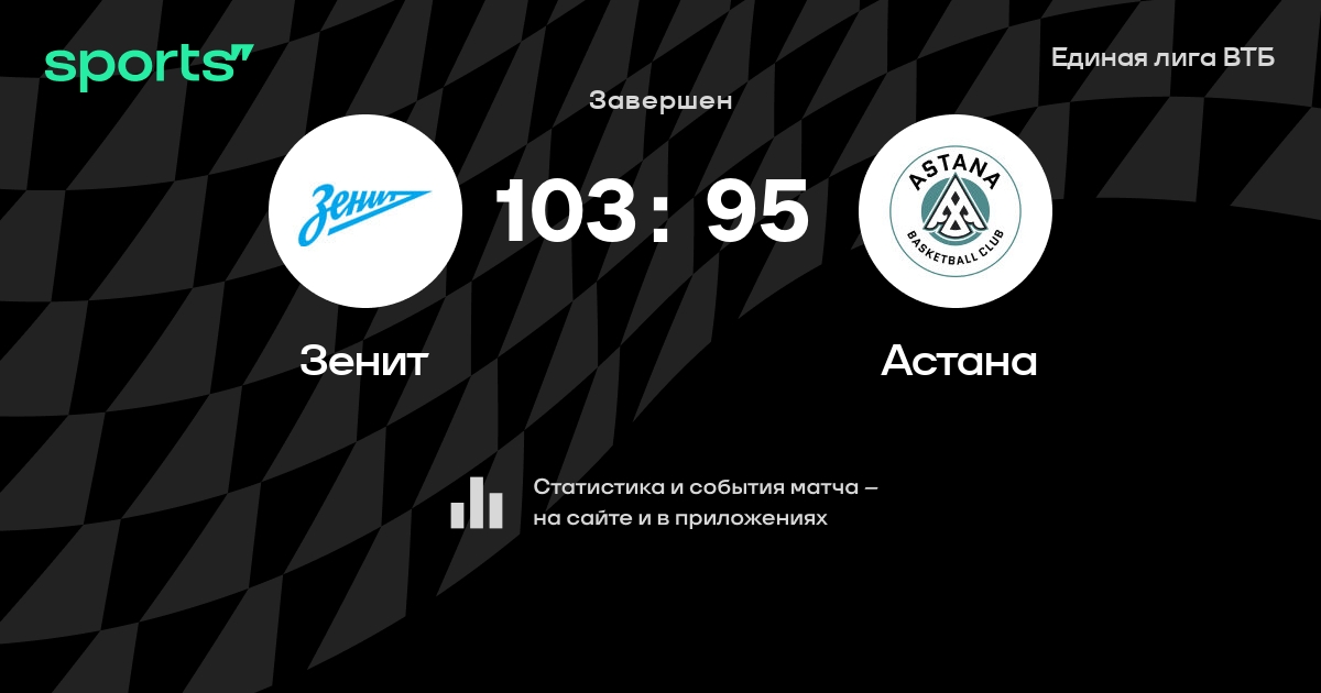 В прошедшем матче в рамках турнира Единая лига ВТБ состоялась встреча команд Зенит - Астана в городе Санкт-Петербург (Россия) на стадионе КСК Арена (вместимость - 7120)