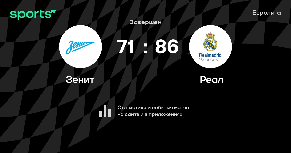 В прошедшем матче в рамках турнира Евролига состоялась встреча команд Зенит - Реал в городе Санкт-Петербург (Россия) на стадионе КСК Арена (вместимость - 7120)