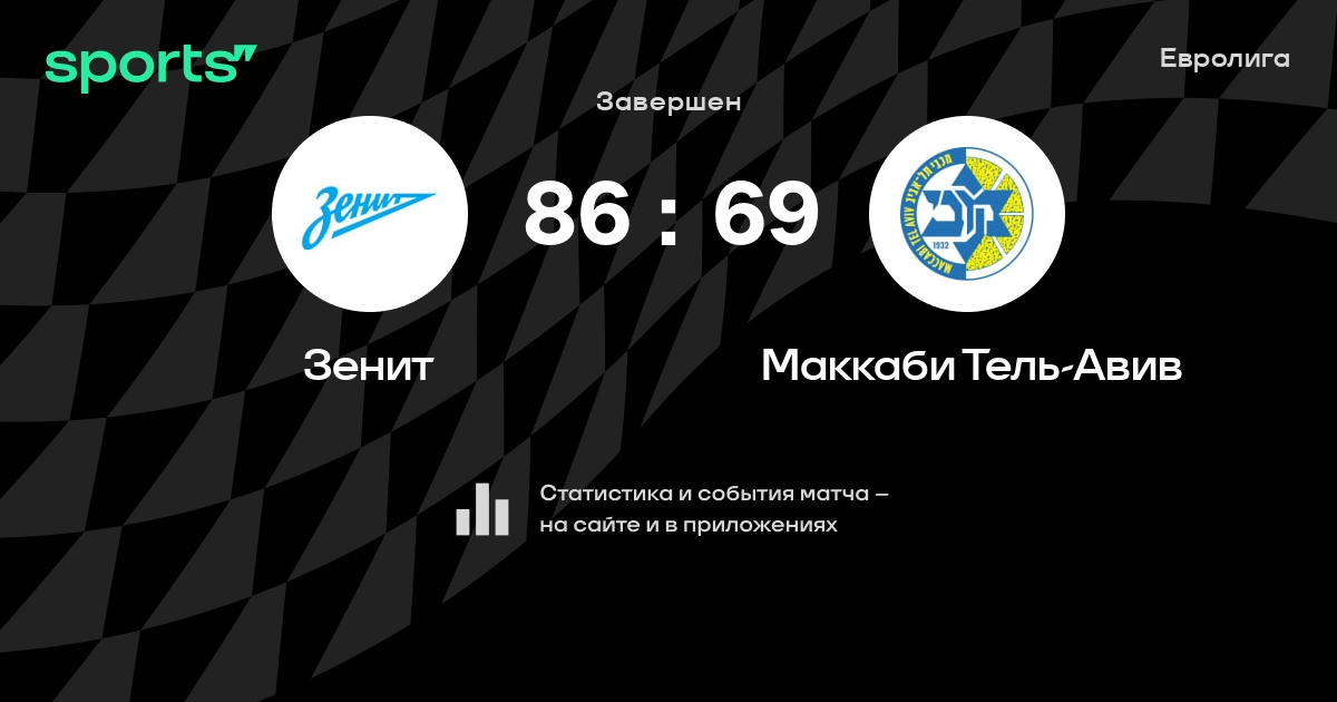 В прошедшем матче в рамках турнира Евролига состоялась встреча команд Зенит - Маккаби Тель-Авив в городе Санкт-Петербург (Россия) на стадионе СК Юбилейный