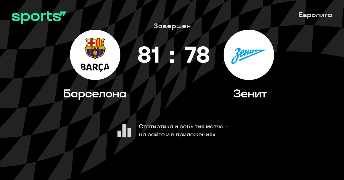 В прошедшем матче в рамках турнира Евролига (Четвертьфинал) состоялась встреча команд Барселона - Зенит в городе Барселона (Испания) на стадионе Палау Блауграна (вместимость - 7585)