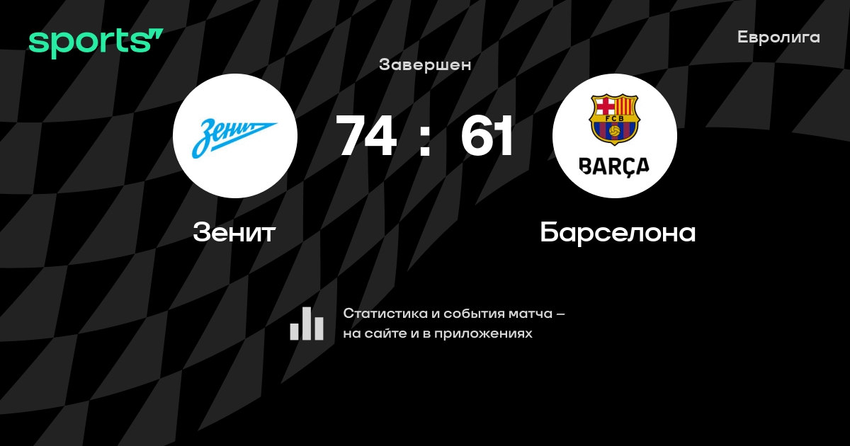 В прошедшем матче в рамках турнира Евролига (Четвертьфинал) состоялась встреча команд Зенит - Барселона в городе Санкт-Петербург (Россия) на стадионе КСК Арена (вместимость - 7120)