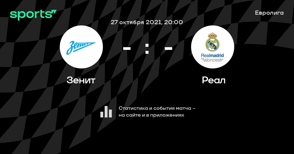 В предстоящем матче в рамках турнира Евролига пройдет встреча команд Зенит - Реал в городе Санкт-Петербург (Россия) на стадионе СК Юбилейный.