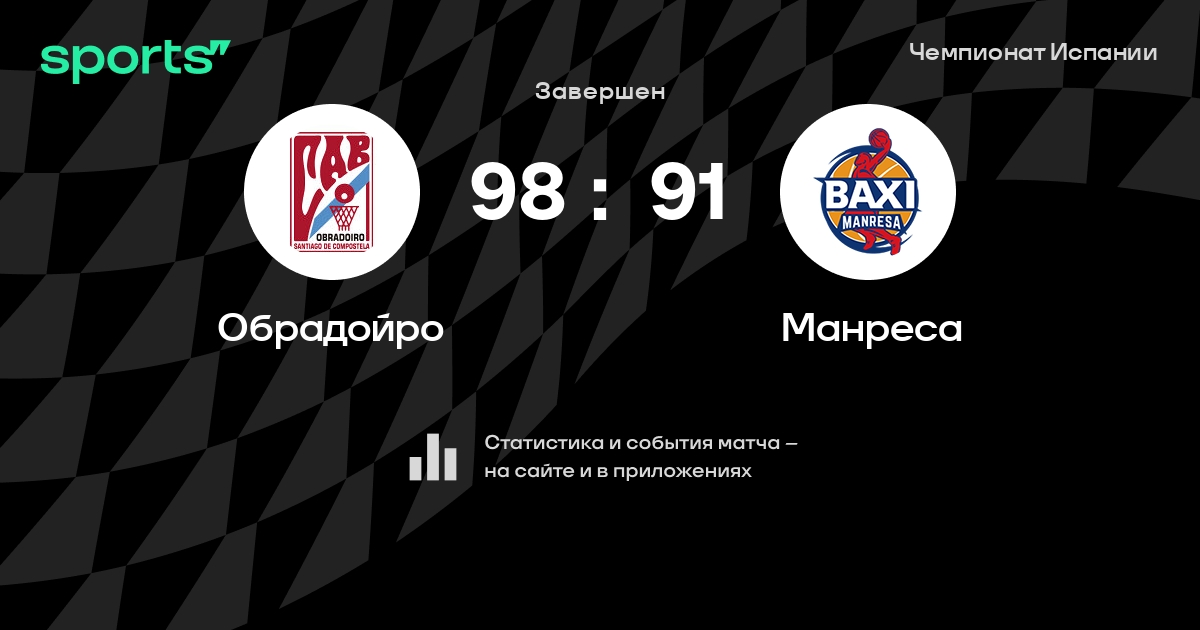 В прошедшем матче в рамках турнира Чемпионат Испании состоялась встреча команд Обрадойро - Манреса в городе Santiago de Compostela на стадионе Pabellón Multiusos Fontes do Sar
