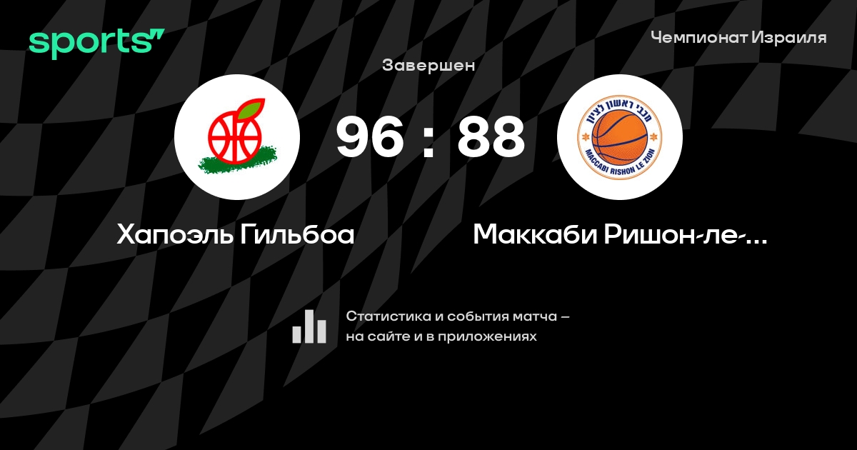 В прошедшем матче в рамках турнира Чемпионат Израиля состоялась встреча команд Хапоэль Гильбоа - Маккаби Ришон-ле-Цион в городе Gan Ner на стадионе Gan Ner Sports Hall