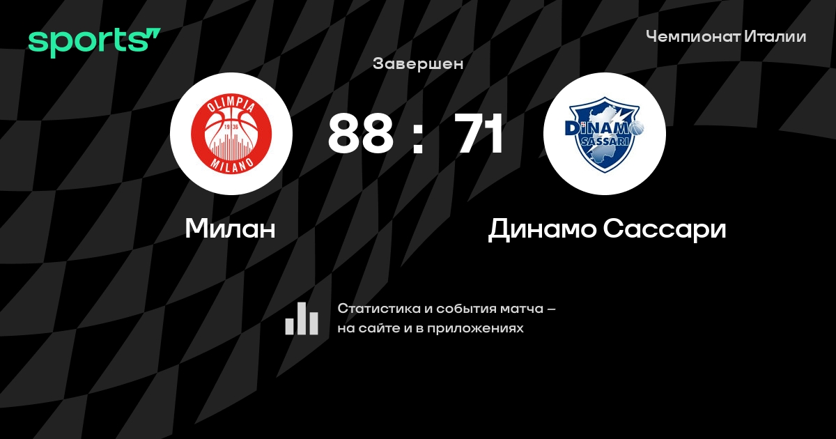 В прошедшем матче в рамках турнира Чемпионат Италии (Полуфинал) состоялась встреча команд Милан - Динамо Сассари в городе Ассаго (Италия) на стадионе Униполь Форум (вместимость - 11200)