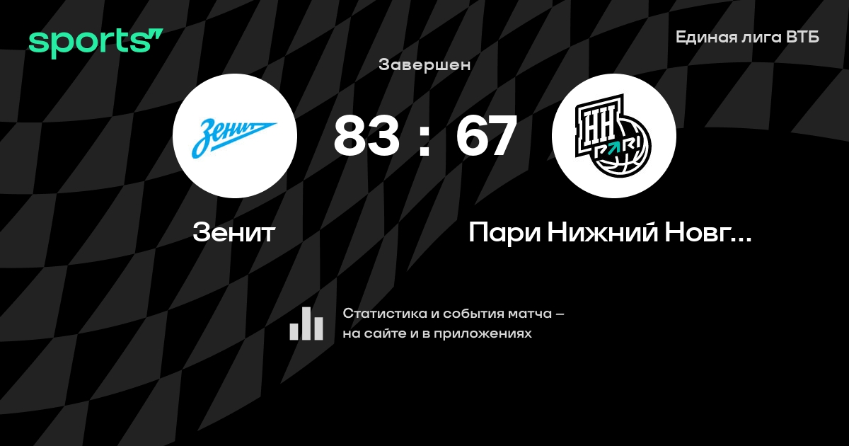 В прошедшем матче в рамках турнира Единая лига ВТБ состоялась встреча команд Зенит - Пари Нижний Новгород в городе Санкт-Петербург (Россия) на стадионе КСК Арена (вместимость - 7120)