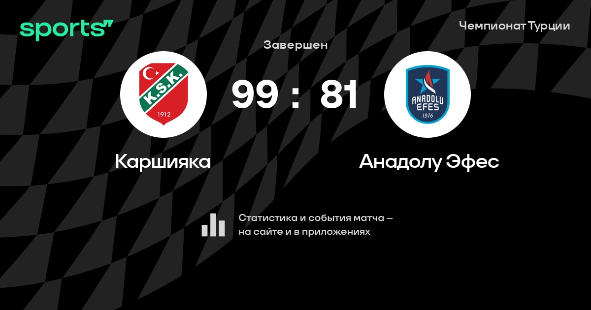 В прошедшем матче в рамках турнира Чемпионат Турции состоялась встреча команд Каршияка - Анадолу Эфес в городе Измир (Турция) на стадионе Каршияка Арена (вместимость - 6500)