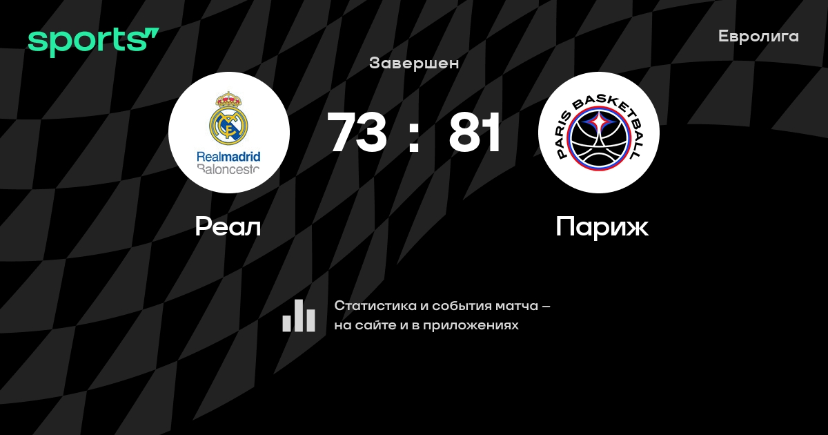 В прошедшем матче в рамках турнира Евролига (Плей-ин) состоялась встреча команд Реал - Париж в городе Мадрид (Испания) на стадионе Мовистар Арена (вместимость - 15000)