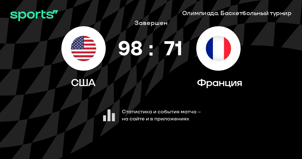 В прошедшем матче в рамках турнира Олимпиада. Баскетбольный турнир (Группа A) состоялась встреча команд США - Франция в городе Лондон (Англия) на стадионе Баскетбольная Олимпийская Арена (вместимость - 12000)