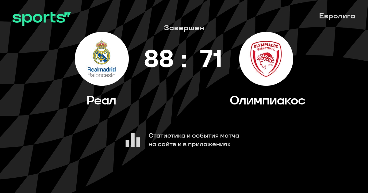 В прошедшем матче в рамках турнира Евролига (Четвертьфинал) состоялась встреча команд Реал - Олимпиакос в городе Мадрид (Испания) на стадионе Мовистар Арена (вместимость - 15000)