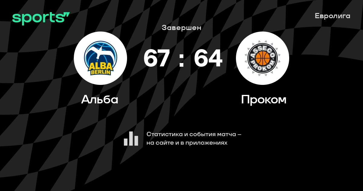 В прошедшем матче в рамках турнира Евролига (Группа B) состоялась встреча команд Альба - Проком в городе Берлин (Германия) на стадионе Убер Арена (вместимость - 16000)