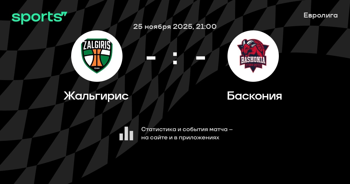 В предстоящем матче в рамках турнира Евролига пройдет встреча команд Жальгирис - Баскония в городе Каунас (Литва) на стадионе Жальгирис Арена.