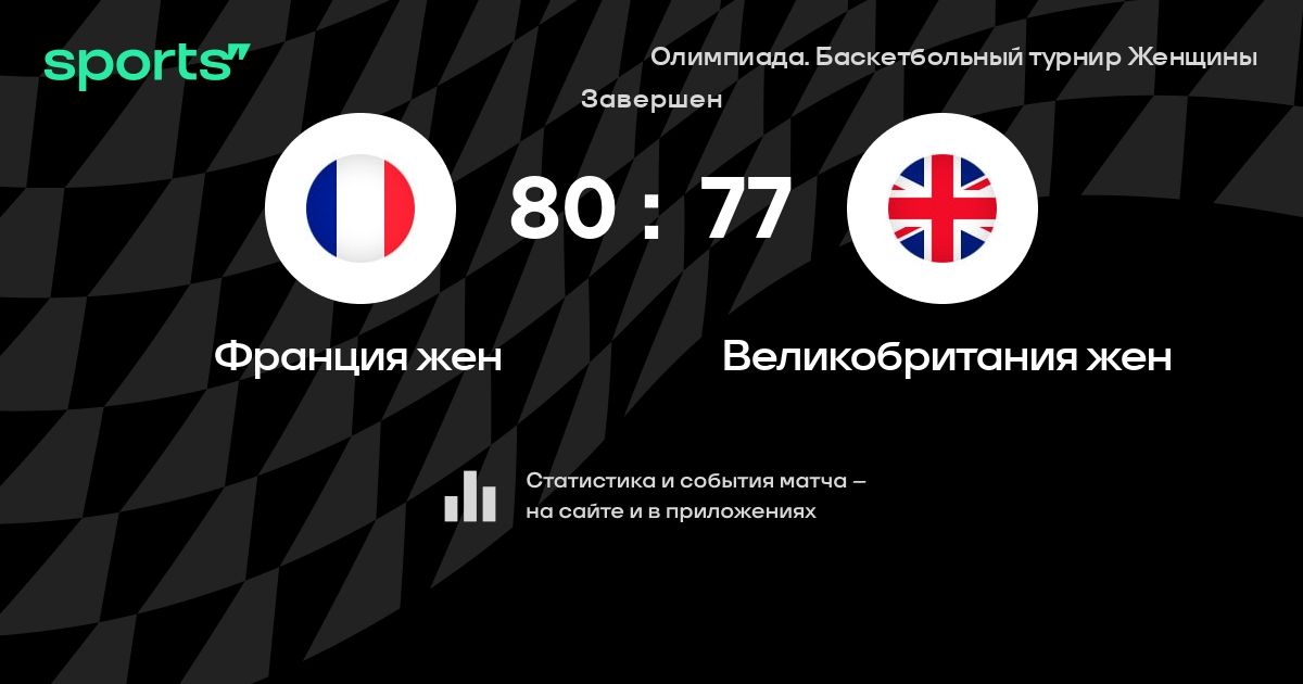 В прошедшем матче в рамках турнира Олимпиада. Баскетбольный турнир Женщины (Группа B) состоялась встреча команд Франция жен - Великобритания жен в городе Лондон (Англия) на стадионе Баскетбольная Олимпийская Арена (вместимость - 12000)
