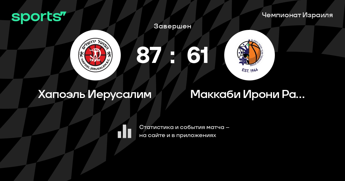 В прошедшем матче в рамках турнира Чемпионат Израиля (Четвертьфинал) состоялась встреча команд Хапоэль Иерусалим - Маккаби Ирони Рамат-Ган в городе Jerusalem на стадионе Jerusalem Payis Arena
