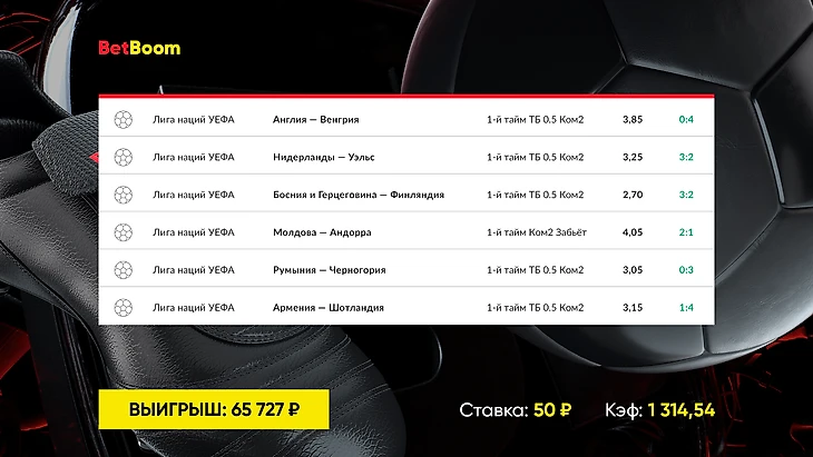 Клиент BetBoom собрал успешный экспресс с коэффициентом 1314,54! Он поставил 50 рублей на шесть матчей Лиги наций УЕФА. Сумма выигрыша составила 65 727 рублей.