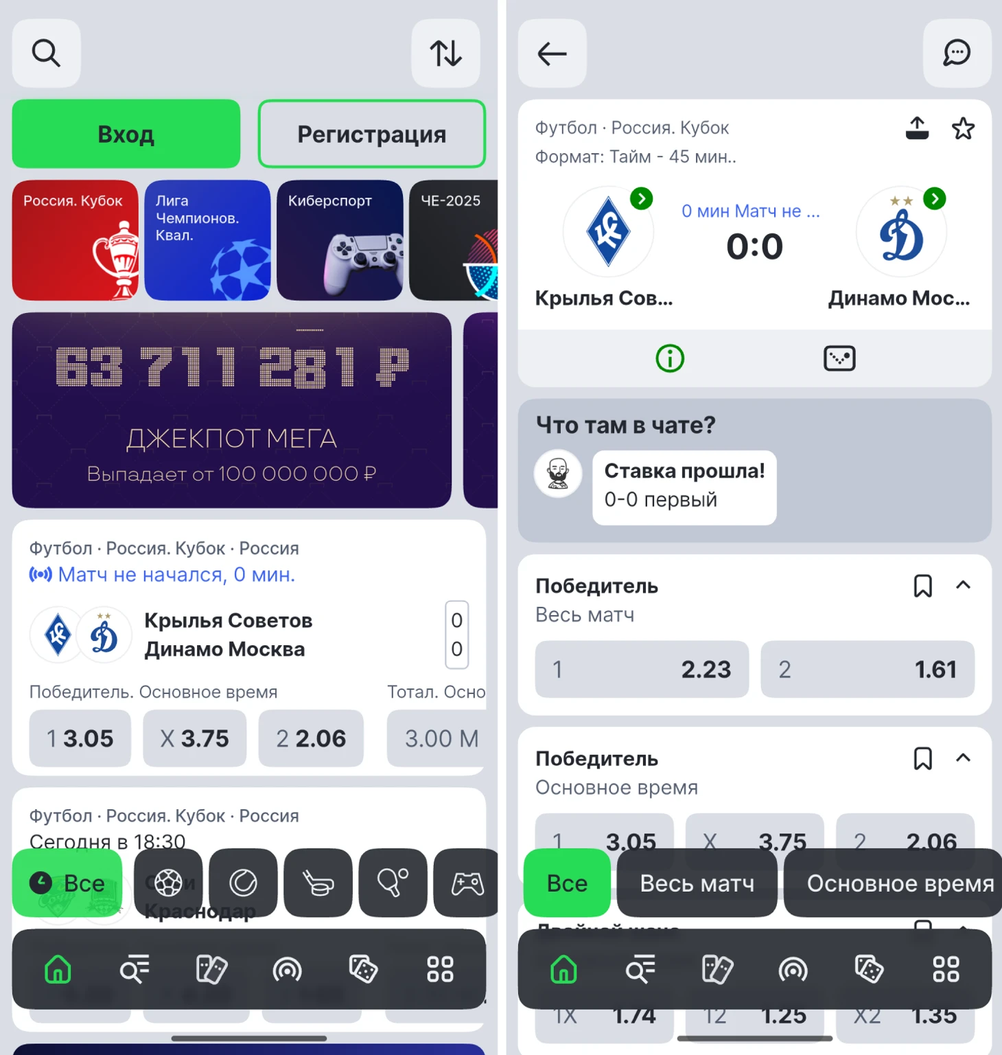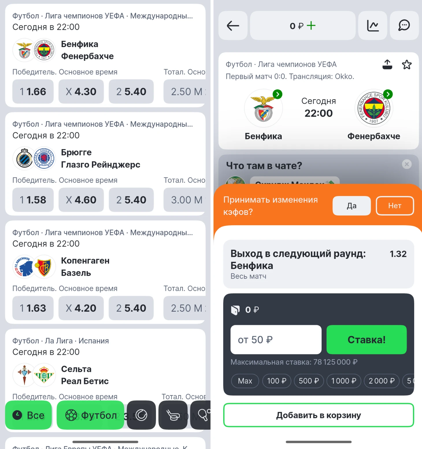 Выберите событие (матч), на которое хотите сделать ставку, раскройте роспись и определитесь с исходом. Около каждого варианта указан коэффициент. Нажмите на него, чтобы перенести событие в купон.