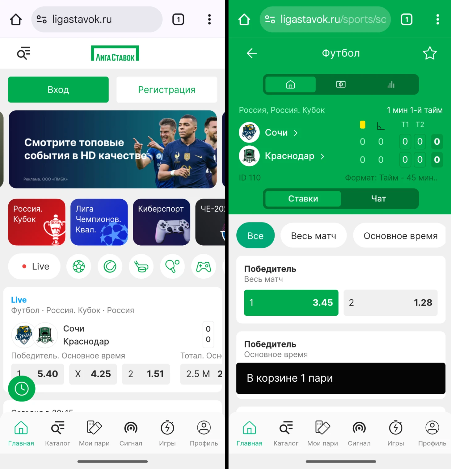 Визуально мобильный вариант похож на основной сайт, хотя есть и небольшие отличия. Мобильная версия «Лиги Ставок» позволяет полноценно делать ставки на спорт и киберспорт, получать и отыгрывать бонусы, смотреть прямые видеотрансляции, обращаться в саппорт, изучать результаты и статистику. Никаких ограничений по сравнению с десктопным сайтом нет, но стоит отметить, что мобильная версия может работать медленнее приложения на Android.